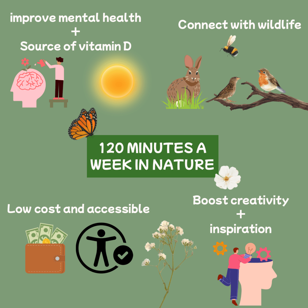 As you are reading this, I want you to picture in your mind a place in nature that you like to visit. Now that you have this place in mind, take a deep, four second breath in… now a long, four second exhale out. Repeat this once more. See? Simply by picturing ourselves in a calm natural space, a sense of calm washes over like a shallow wave on the beach’s shore. But why is this the case? What is the connection between nature, and the production of these calm feelings produced by our brains? According to an article by Matthew Browning, published in the Scientific Reports journal (2023), being in the presence of nature, whether it be in person, or virtually, creates the same reaction in our nervous system as after we eat a delicious meal and we begin to wind down, feel satisfied and relaxed. In addition to this soothing feeling, being in the presence of nature has a lot of benefits for our mental and well being. 120 minutes feels like a long time to devote to a single task, most movies aren’t even that long. However, if 120 minutes is broken up into the seven days of the week, that only makes it around 18 minutes a day. According to a study of 19k participants conducted by Matthew P. White published in the Scientific Reports Journal (2019), spending at least 120 minutes a week in nature showed to have significant health benefits as was reported by the participants. The benefits that were seen in the participants began with just 1 hour of nature exposure and peaked at 2 hours of nature exposure a week. In addition to time spent in natural environments outside one’s neighborhood, the study also focused on green spaces, and parks around the participant’s neighborhoods, which goes to show that even if you do not have a national park, or other natural spaces near you, nature provided by our city parks and green spaces are just as beneficial to mental health and well being. The study also emphasized that it did not matter how the two hours a week were divided. You could spend just 10 minutes in nature after work one day, then 5 the next, etc. until it adds up to two hours a week, and reap the mental and physical benefits mother earth’s natural spaces have to offer us.